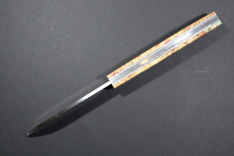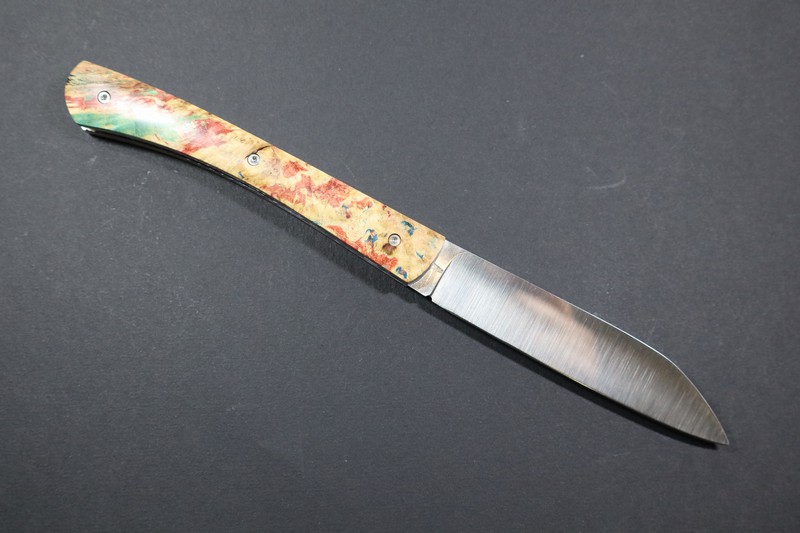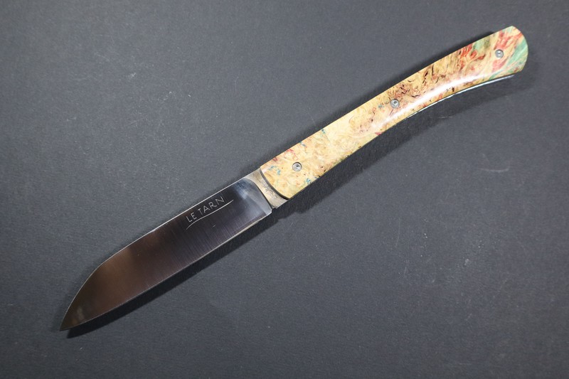 Le Tarn est un couteau artisanal pliant à cran forcé avec butée en acier pour l’arrêt de la lame, évitant ainsi tous risque d’endommager le tranchant en le fermant. Le couteau est le reflet de la vallée du Tarn et de son terroir généreux. L’idée, avec sa lame robuste et coupante, forgée dans les meilleurs aciers, son large manche en bois qui tient bien dans la main, est qu’il devienne un compagnon du quotidien. La lame est en acier inoxydable 14c28n de qualité alimentaire, excellente dureté, excellente résistance à la corrosion et excellente aptitude au polissage. Le ressort est en inox Z20c13. La lame et le ressort ont une épaisseur de 3 mm, les platines 1.5 mm.